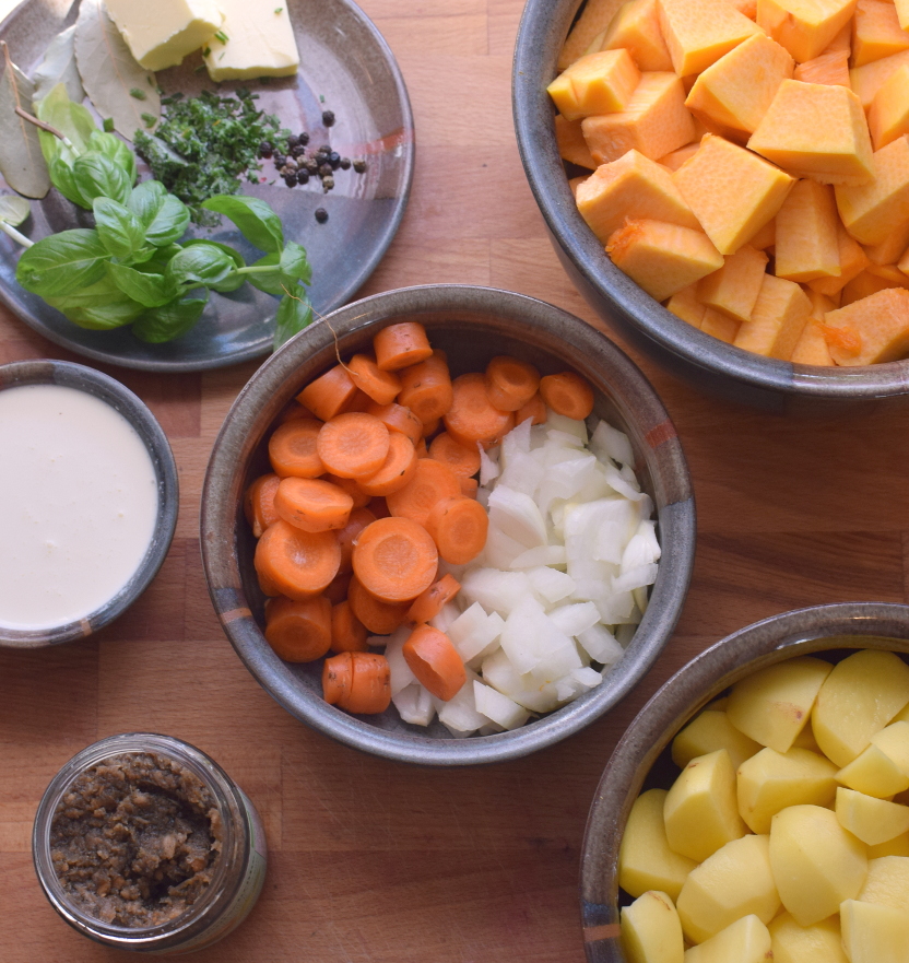 - Peel and dice the potatoes, pumpkin, carrots, and onion.